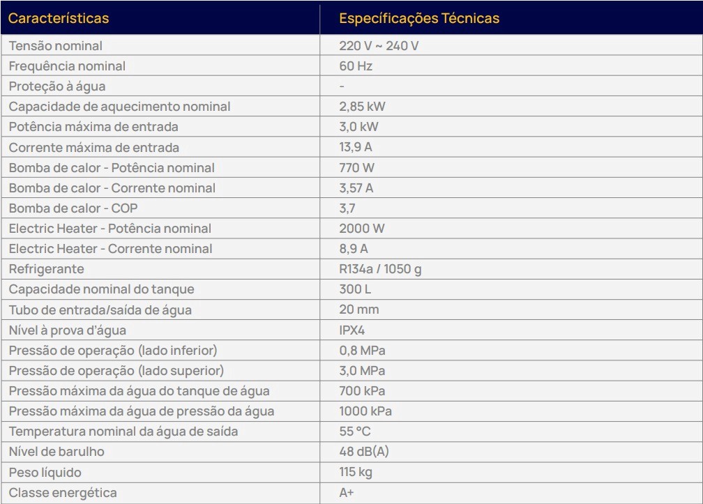 Bomba de calor acoplada de alta eficiência (COP médio até 4) Aquece a água usando até 75% menos energia elétrica do que um boiler convencional com resistência. Resistência elétrica integrada Funciona como apoio nos dias mais frios ou picos de consumo, garantindo água quente mesmo nas condições mais extremas